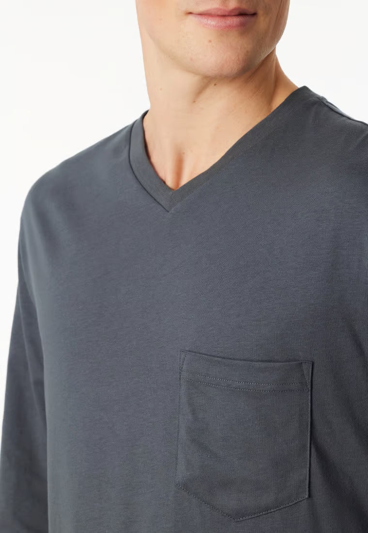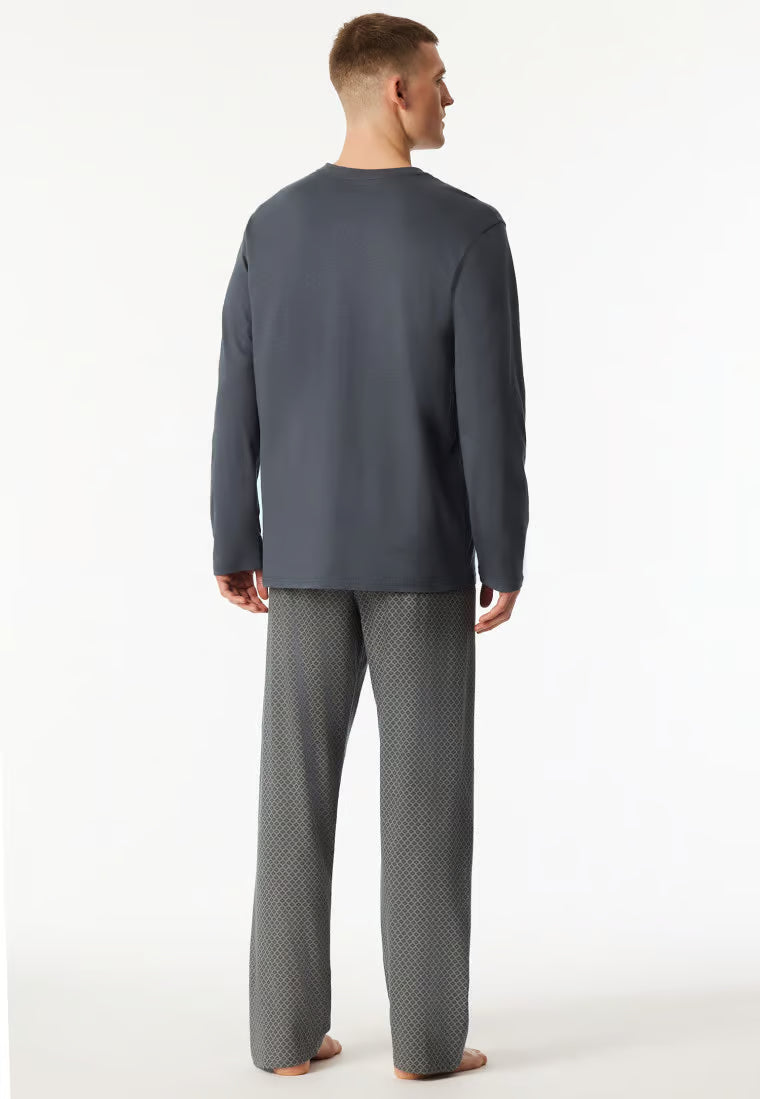 Opis: - Moška pižama z dolgimi rokavi in dolgimi hlačami. - 'V' vratni izrez, z manjšim dekorativnim žepkom na prsni strani. - Hlačnice in rokavi brez patenta. - Dolge hlače z elastičnim pasom, hlače so brez žepov. - Enobarven zgornji del, spodnji del pa je s ponavljajočim vzorcem.