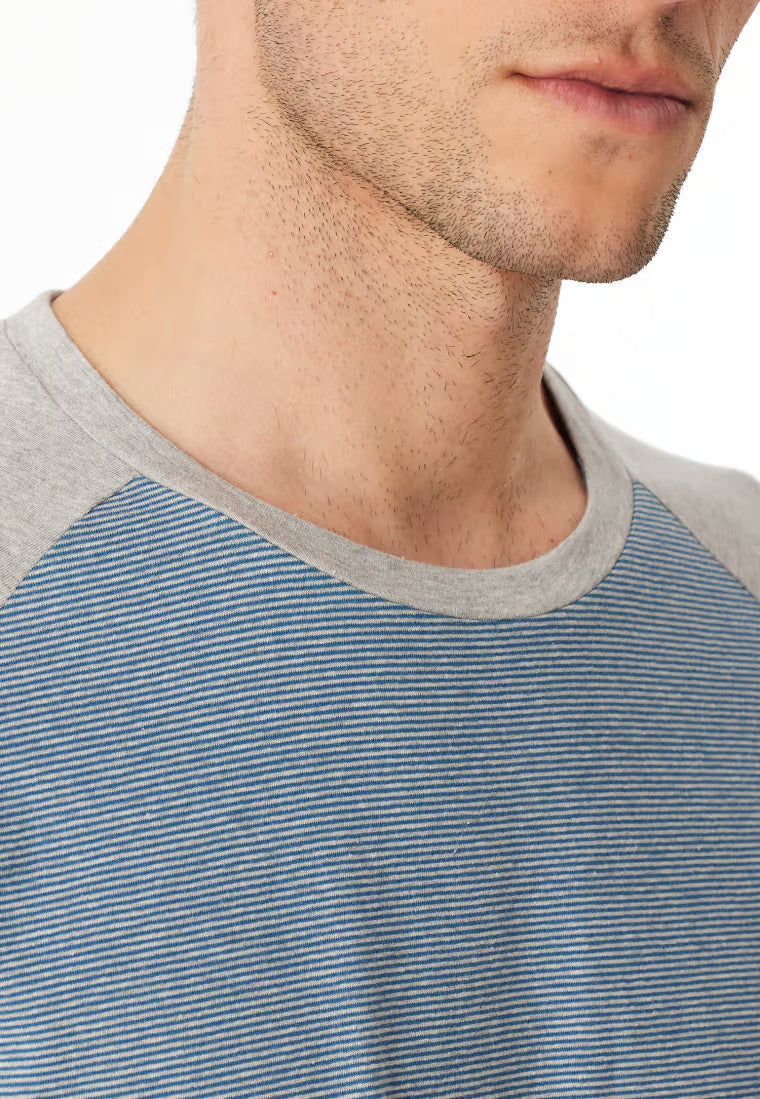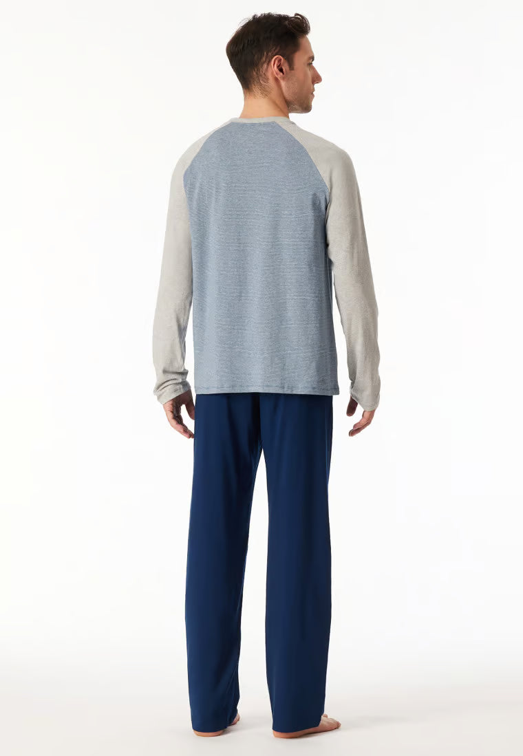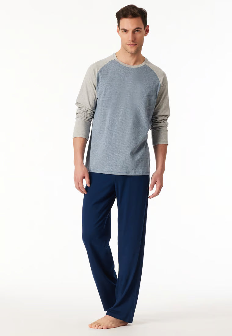 Opis: - Moška pižama z dolgimi rokavi in dolgimi hlačami. - Okrogel vratni izrez. - Hlačnice in rokavi brez patenta. - Dolge hlače z elastičnim pasom. - Brez žepov. - Enobarvne hlače, zgornji del s črtastim vzorcem.