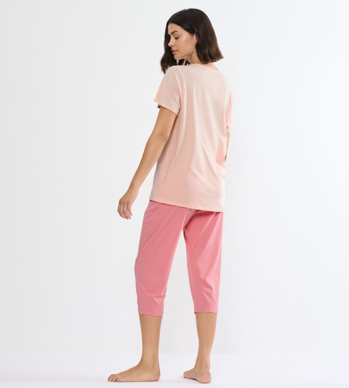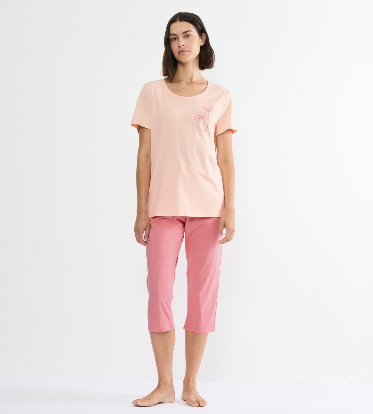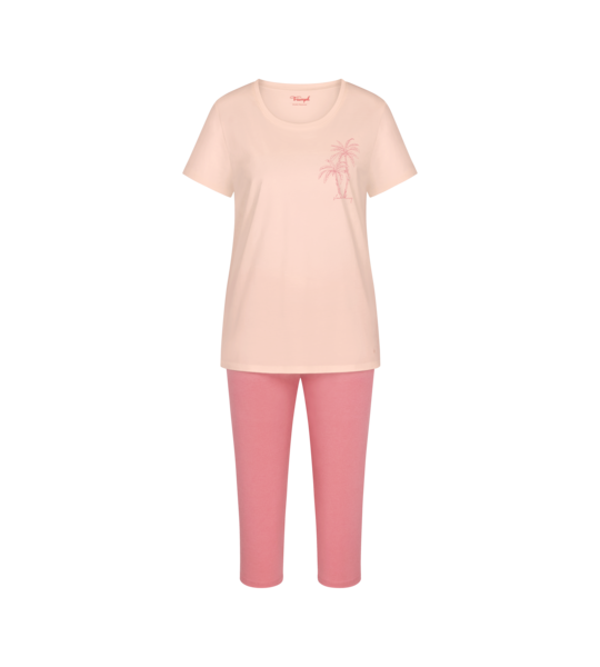 - Ženska pižama s 3/4 dolgimi hlačami (kapri kroj) in kratkimi rokavi zgornjega dela.