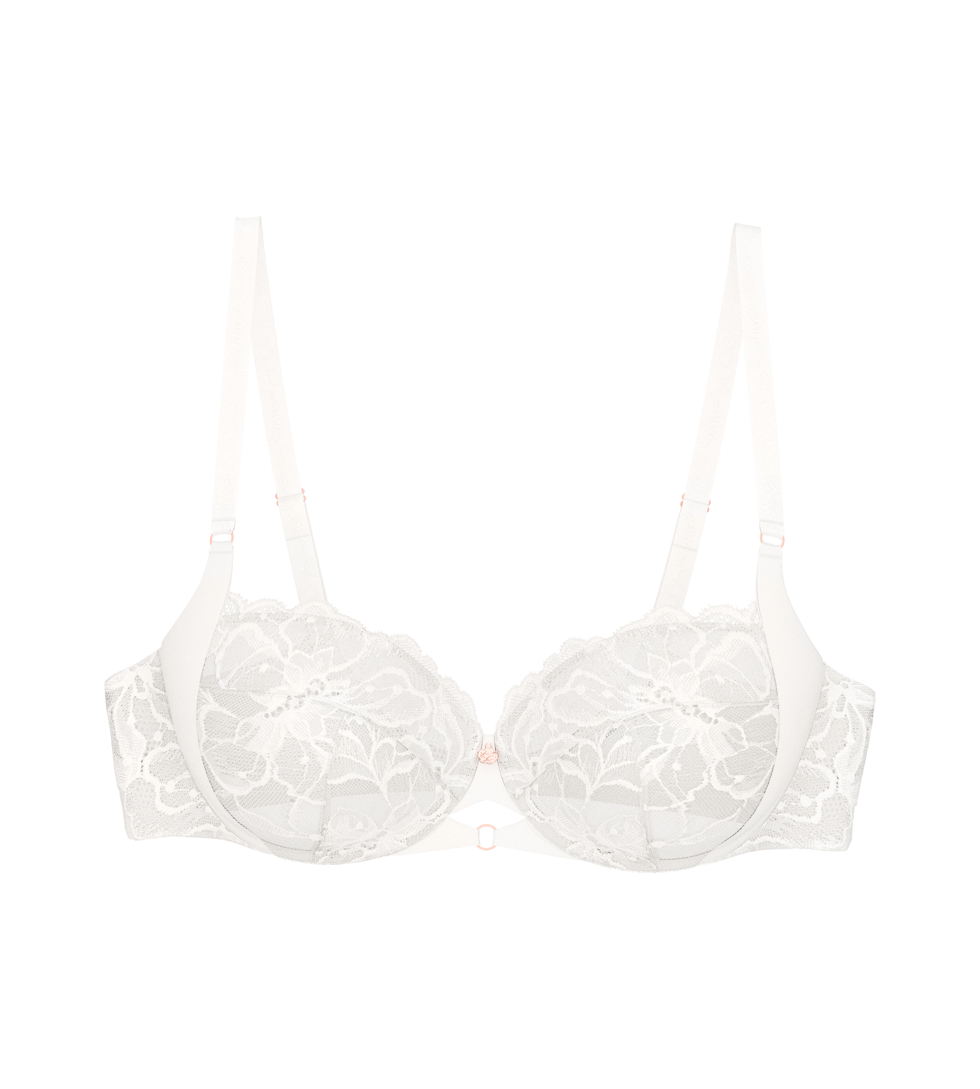 - Nežna čipka s cvetličnim vzorcem na sprednjem delu modrčka.